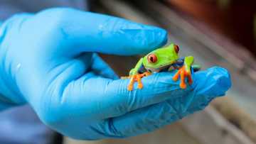 With great care, Yesenia Lacayo transfers a tiny frog from a leaf, where it was sleeping, to a plastic container with breathing holes, some water, and enough room to jump.