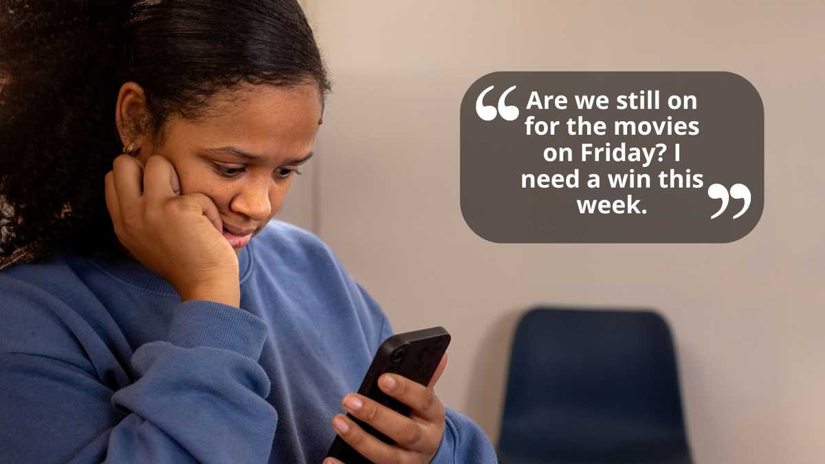 Jason sent a text: Are we still on for the movies on Friday? I need a win this week.