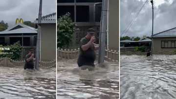 Man anchored to street pole in Cape Town floods casually sips the water: Mzansi lol over his level of chill