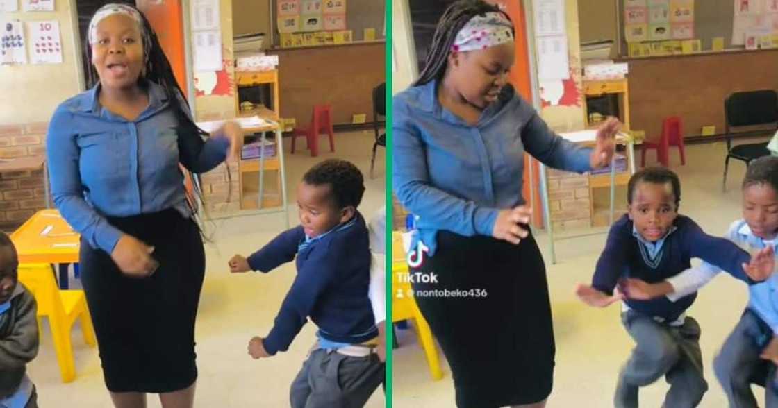 The footage posted on TikTok by Nontobeko Amanda (@nontobeko436) shows the teacher dancing with her enthusiastic little pupils to a tune of a horn which sounds a lot like that of the Shembe church.