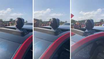 Woman uncomfortably peeps out of car sunroof in funny video, SA laughs hysterically: "New official meme"