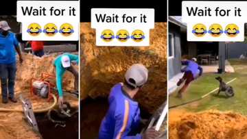 Co-workers prank unsuspecting man with fake snake as he climbs down ladder into deep hole in funny video