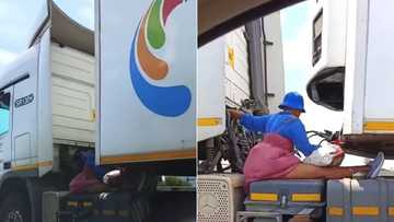 Woman seated outside moving vehicle to hitch ride on delivery truck, extreme video leaves Mzansi divided