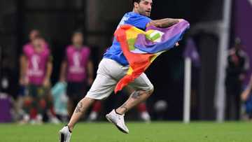 Mario Ferri, 35, a football player with a history of similar stunts, interrupted the Portugal-Uruguay game Monday when he sprinted onto the pitch wearing a blue Superman T-shirt with "Save Ukraine" on the front and "Respect for Iranian Woman" on the back.