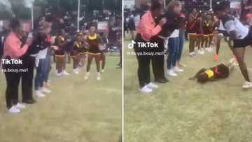 Free State cheerleader gets knocked over by Rugby players during a match: "What was she doing?"